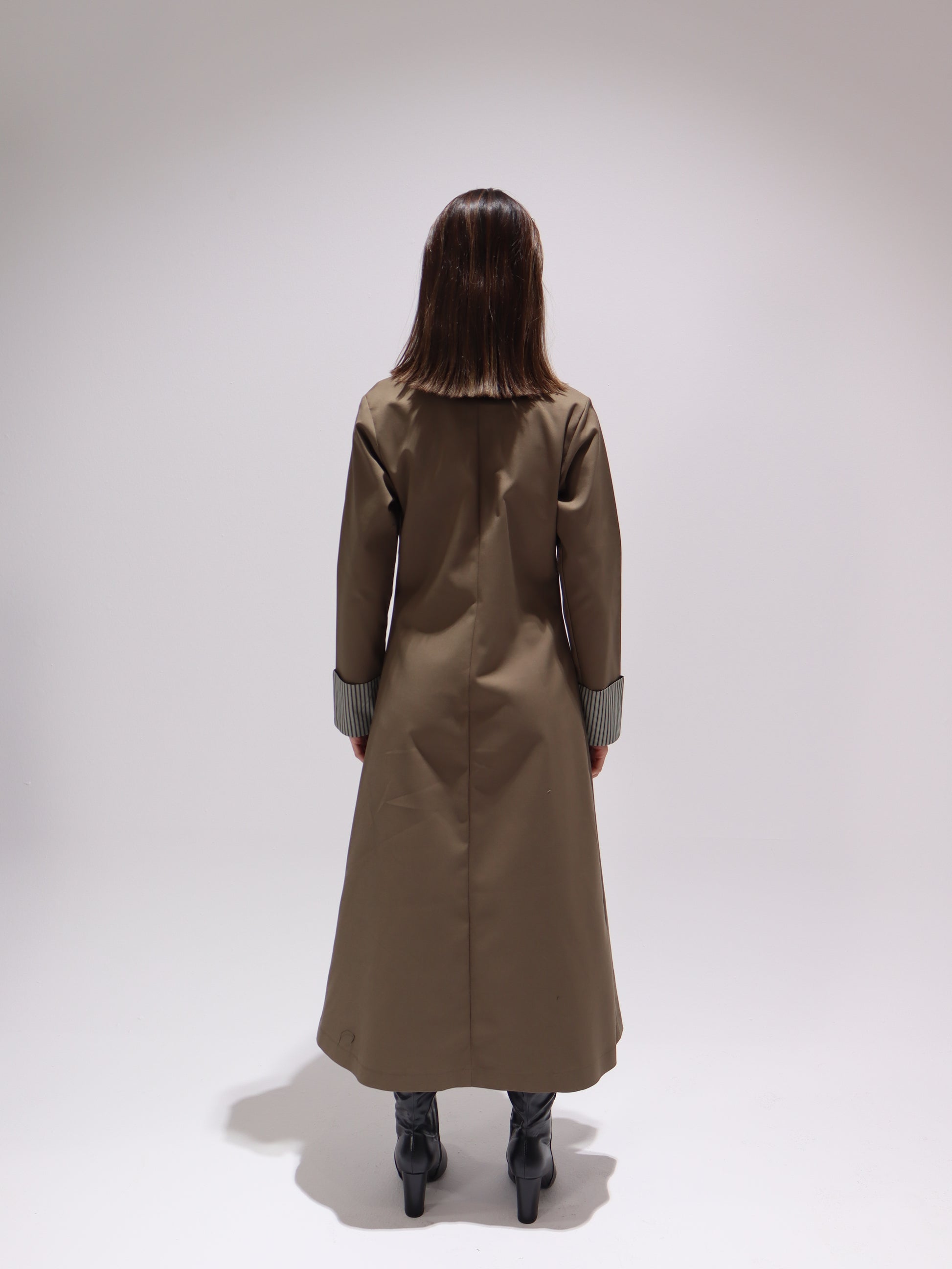 This khaki trench coat is designed with a modern twist, featuring a chic striped lapel and cuffs