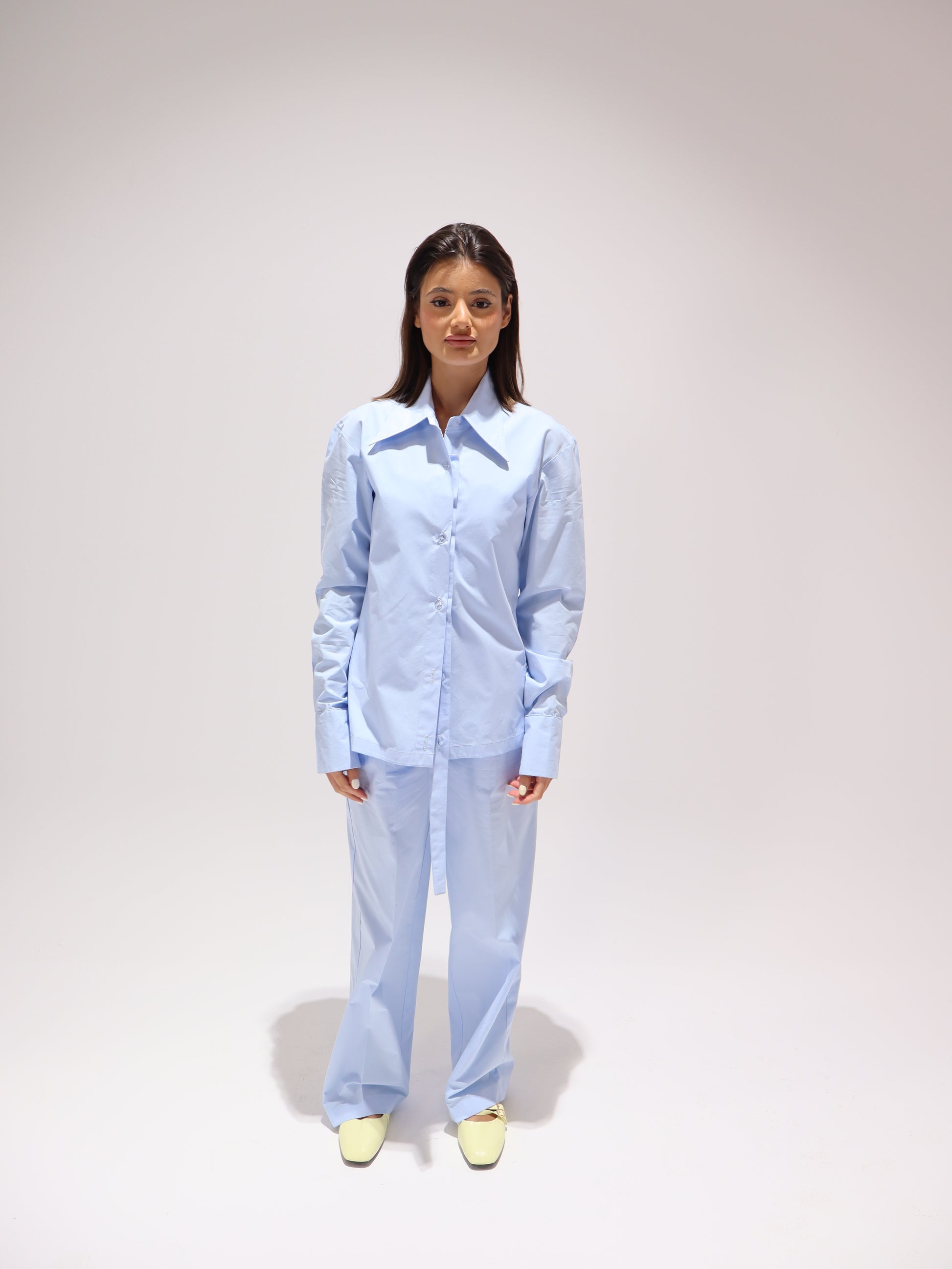 Relaxed two-piece set featuring a button-down shirt with sharp collar and wide-leg trousers. A modern take on everyday comfort and style.