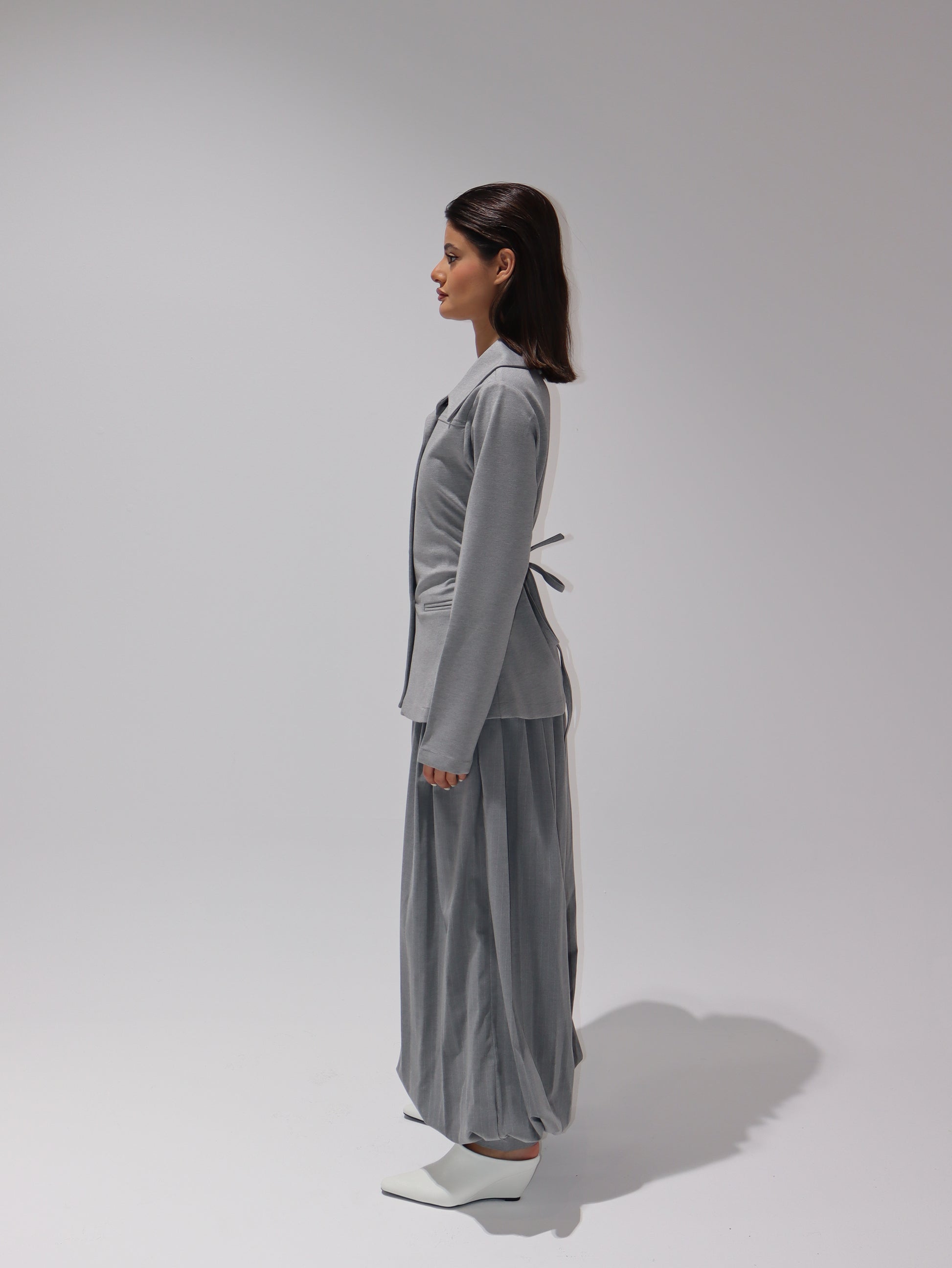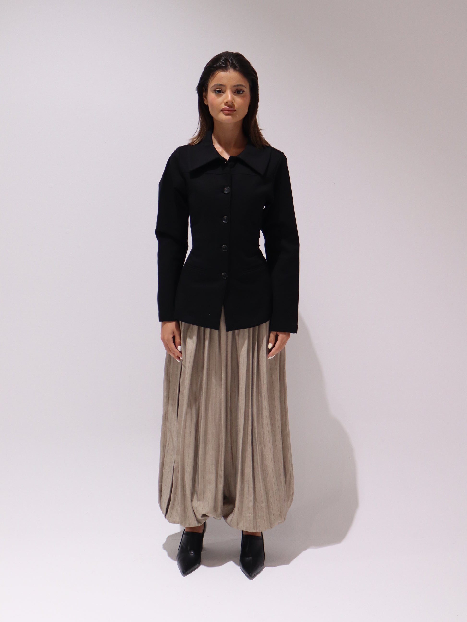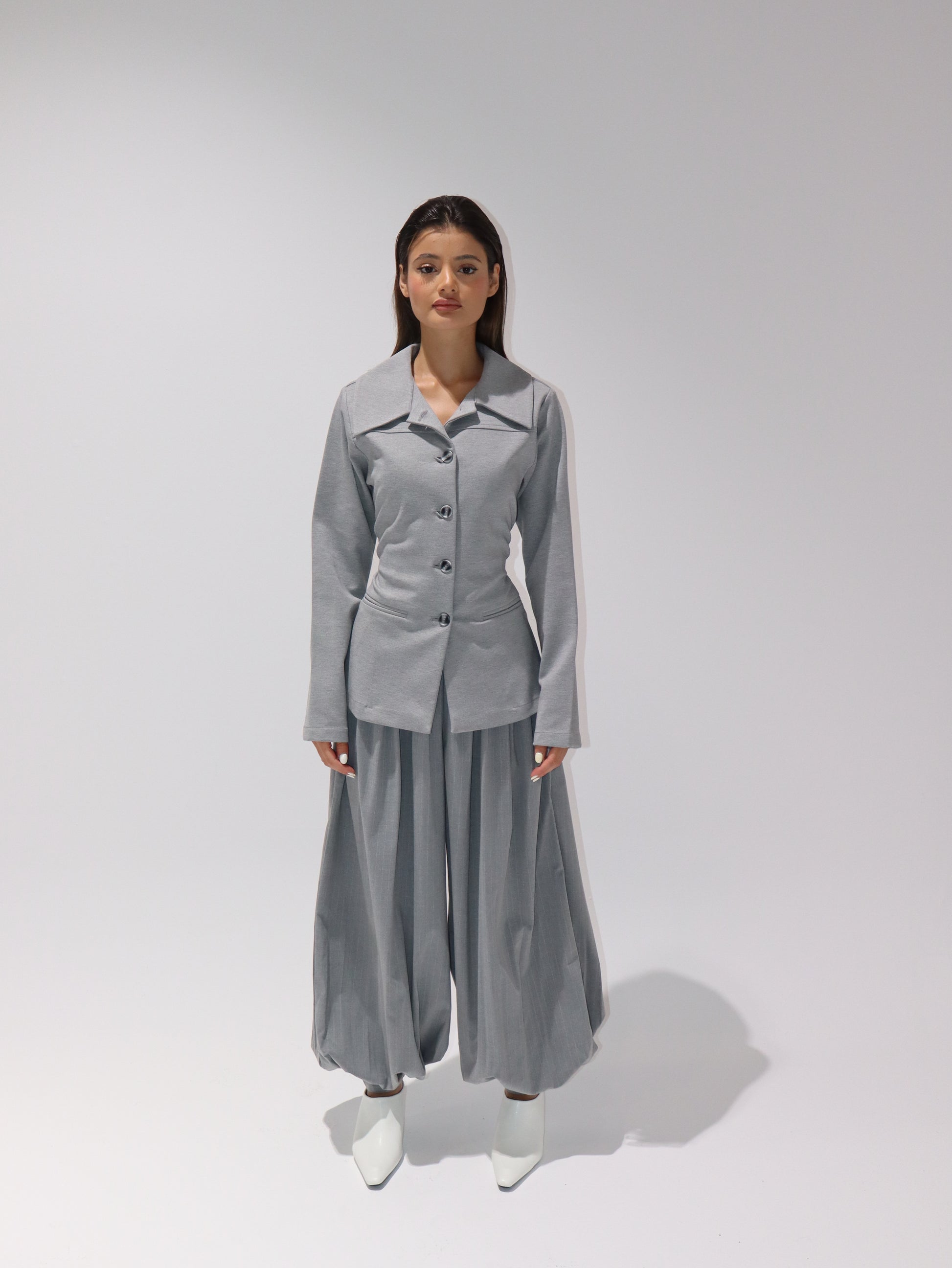 Two-piece set featuring a structured blazer with oversized collar and fitted waist, paired with wide sherwal-style trousers for a bold and modern look.