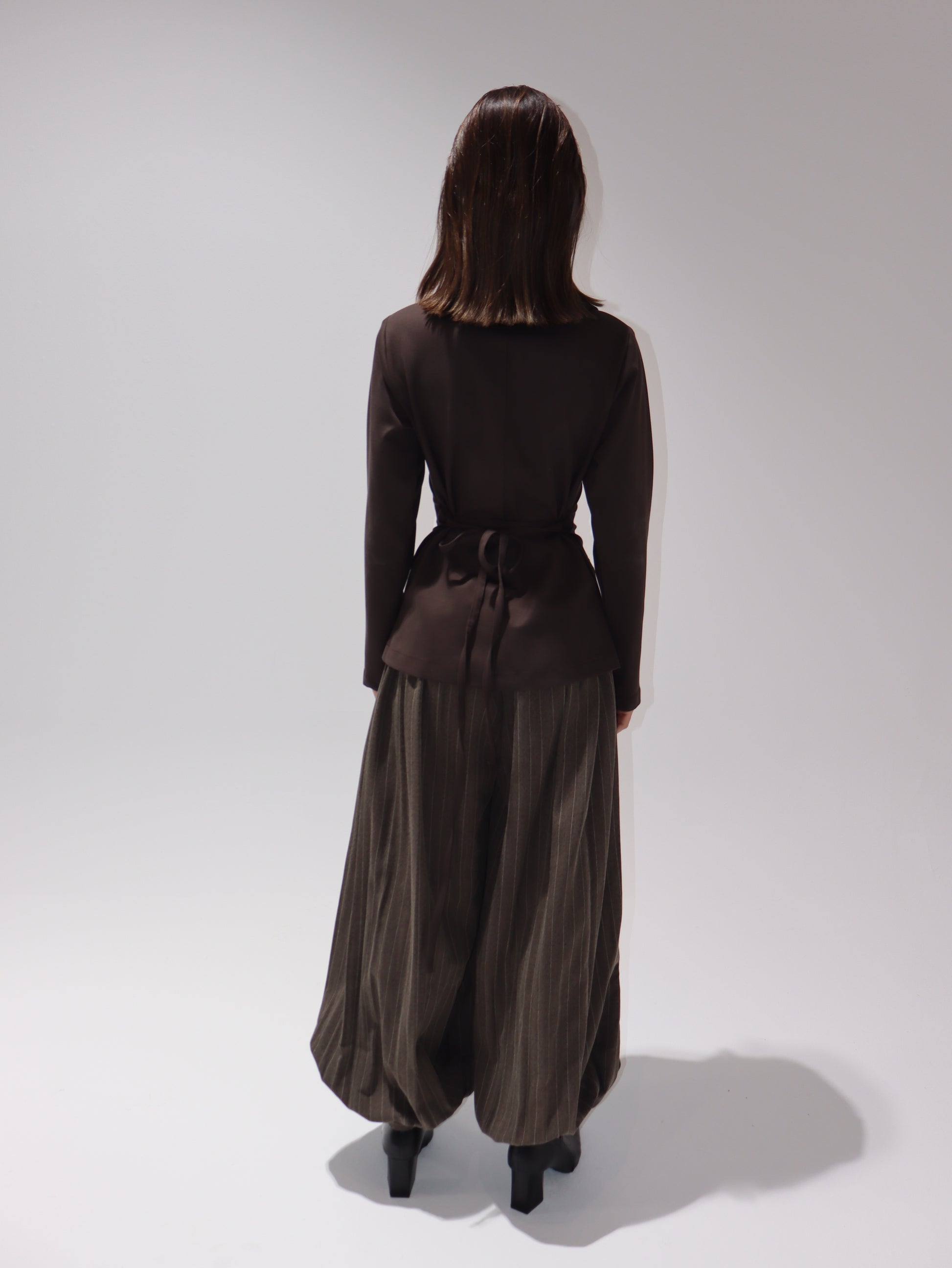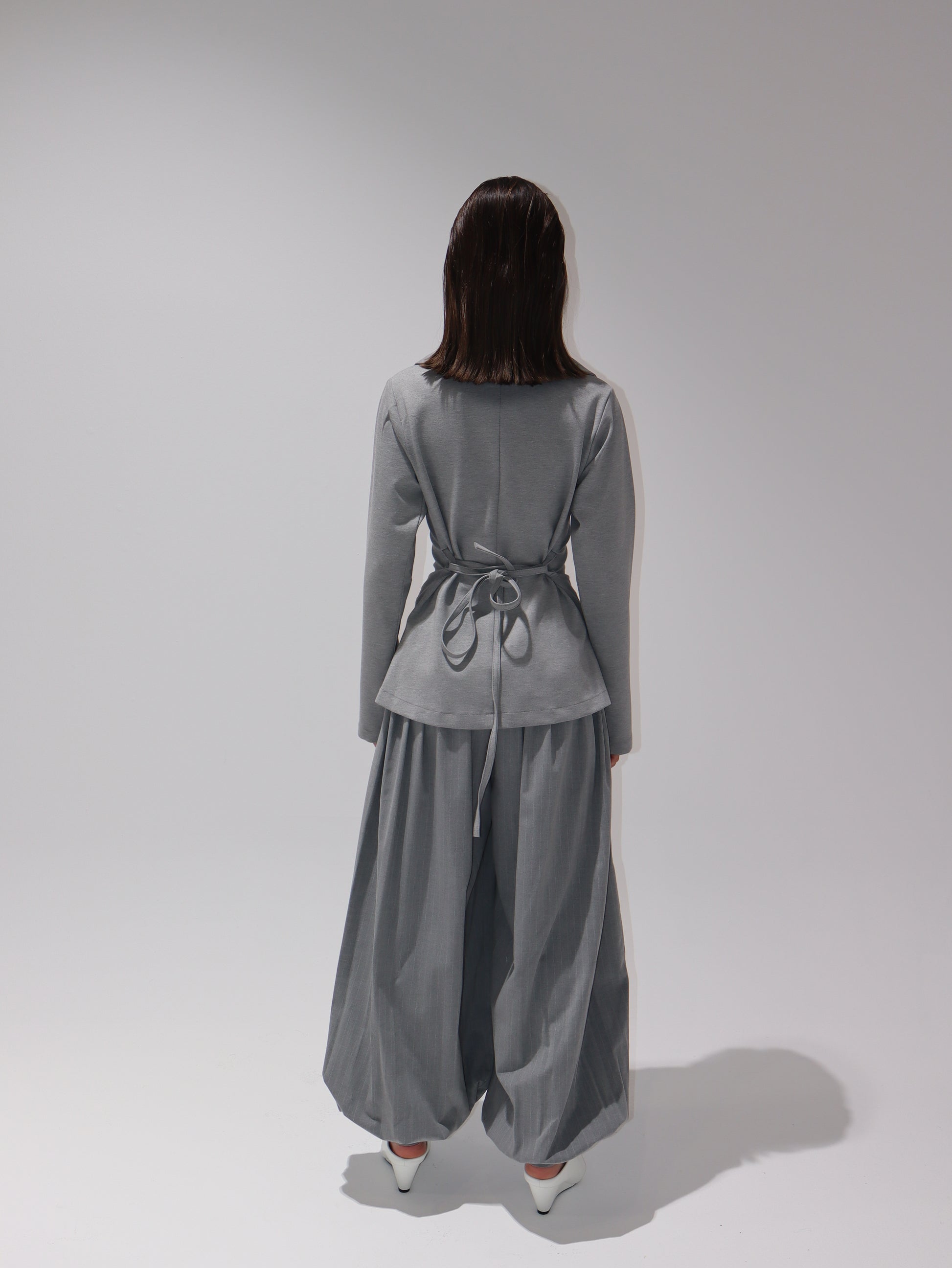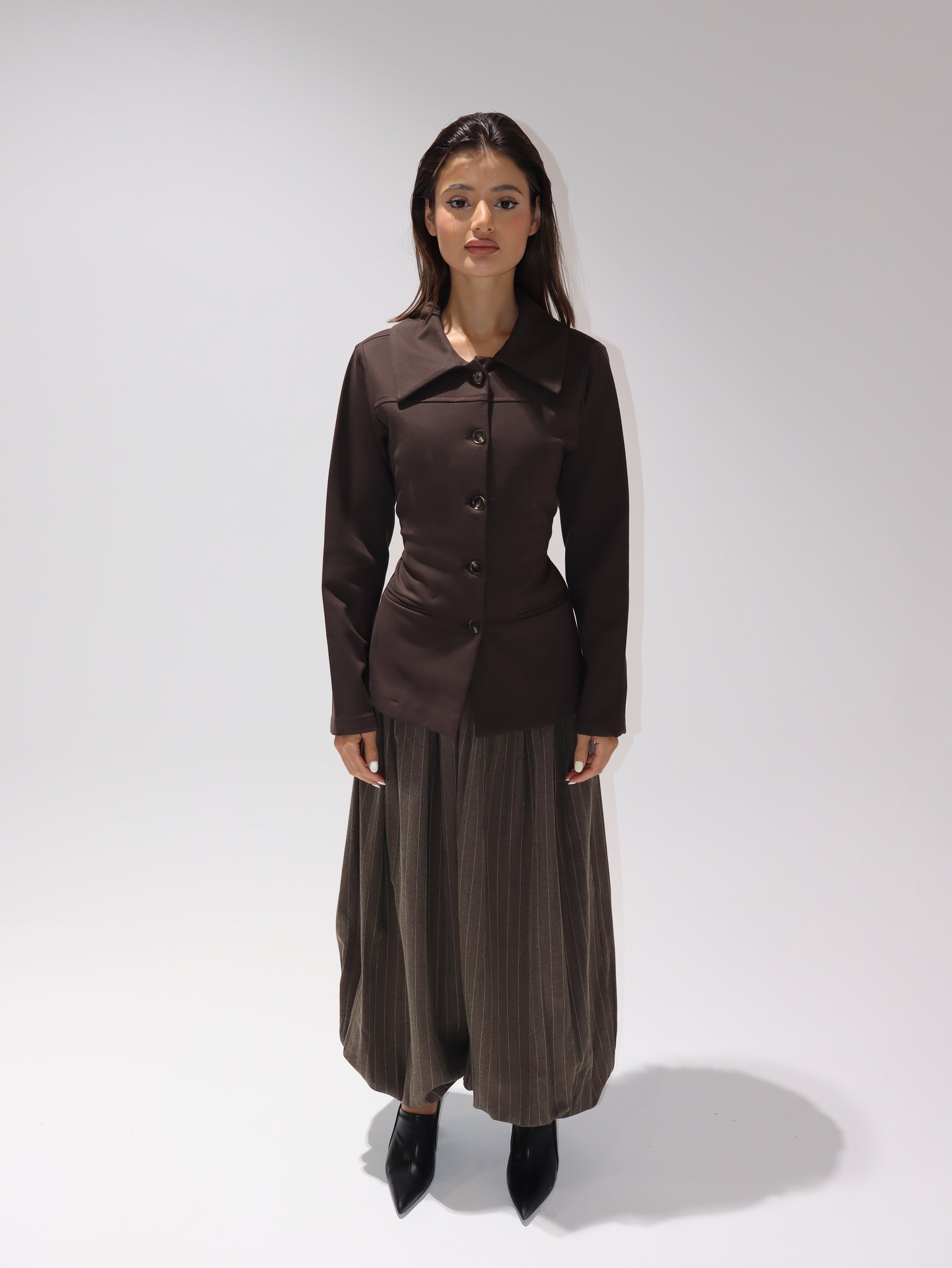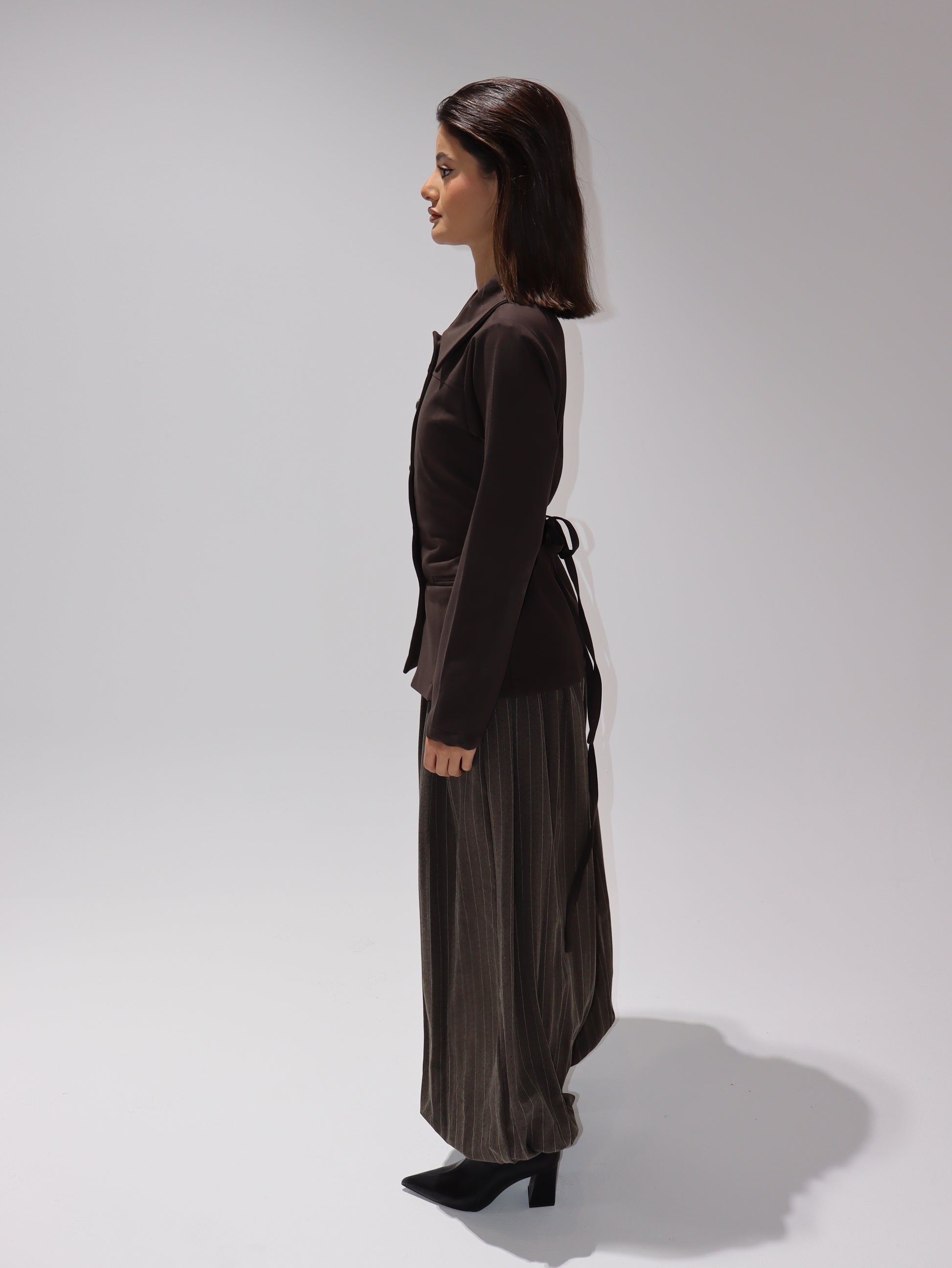 Two-piece set featuring a structured blazer with oversized collar and fitted waist, paired with wide sherwal-style trousers for a bold and modern look.