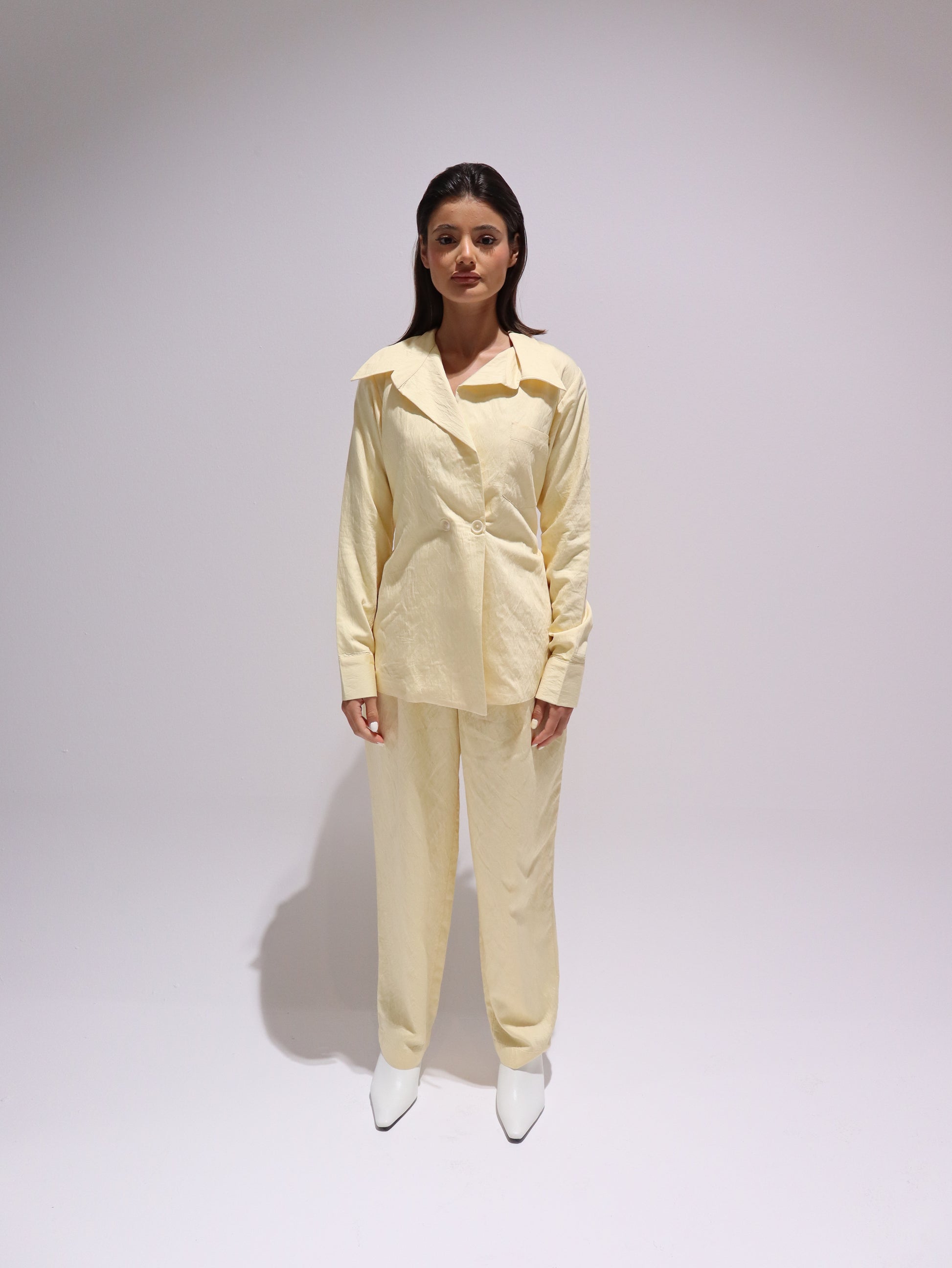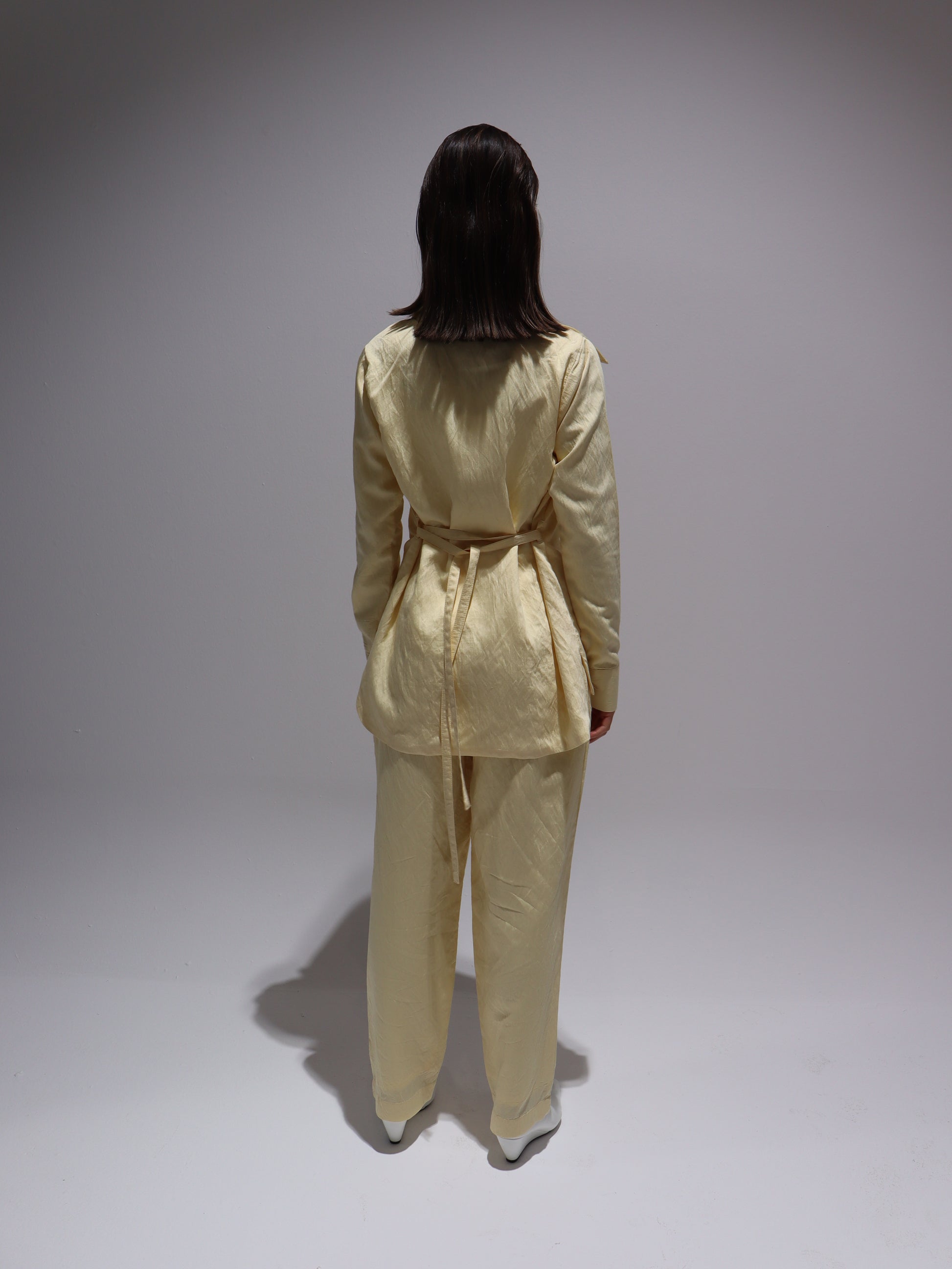 Soft yellow suit with a relaxed silhouette. Features a wrap-style blazer with tie detail and matching straight-cut pants. A fresh and minimal look that balances comfort and elegance.