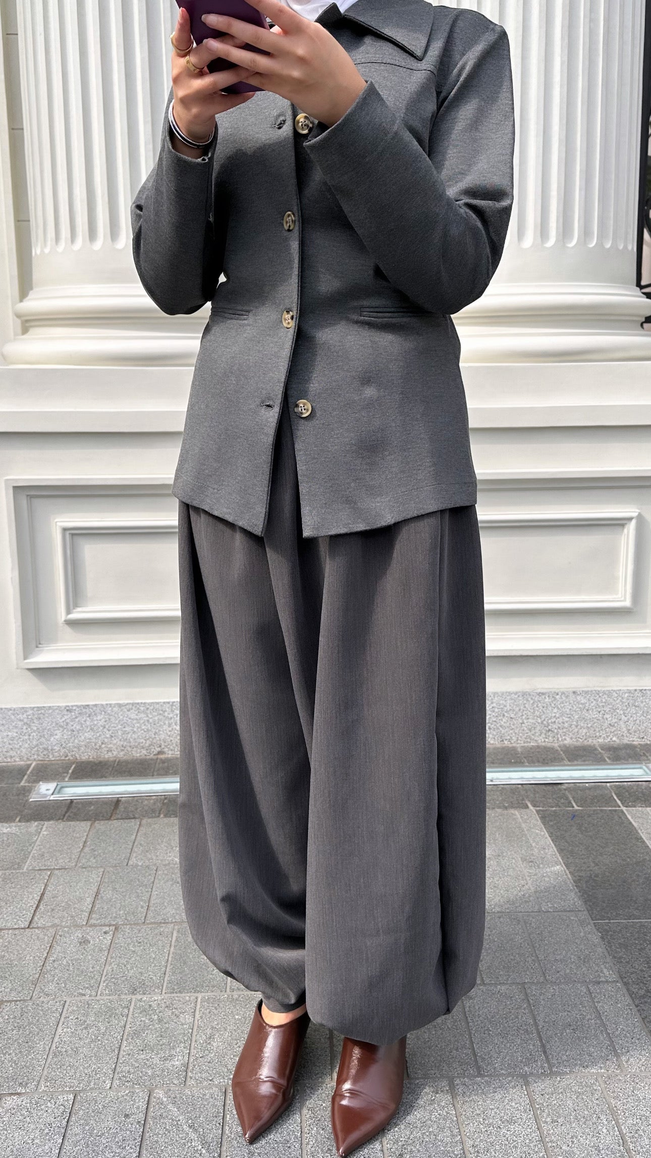 The jacket features a clean-cut design with subtle stitching and button detailing, paired with relaxed high-waist trousers for a graceful flow and comfort