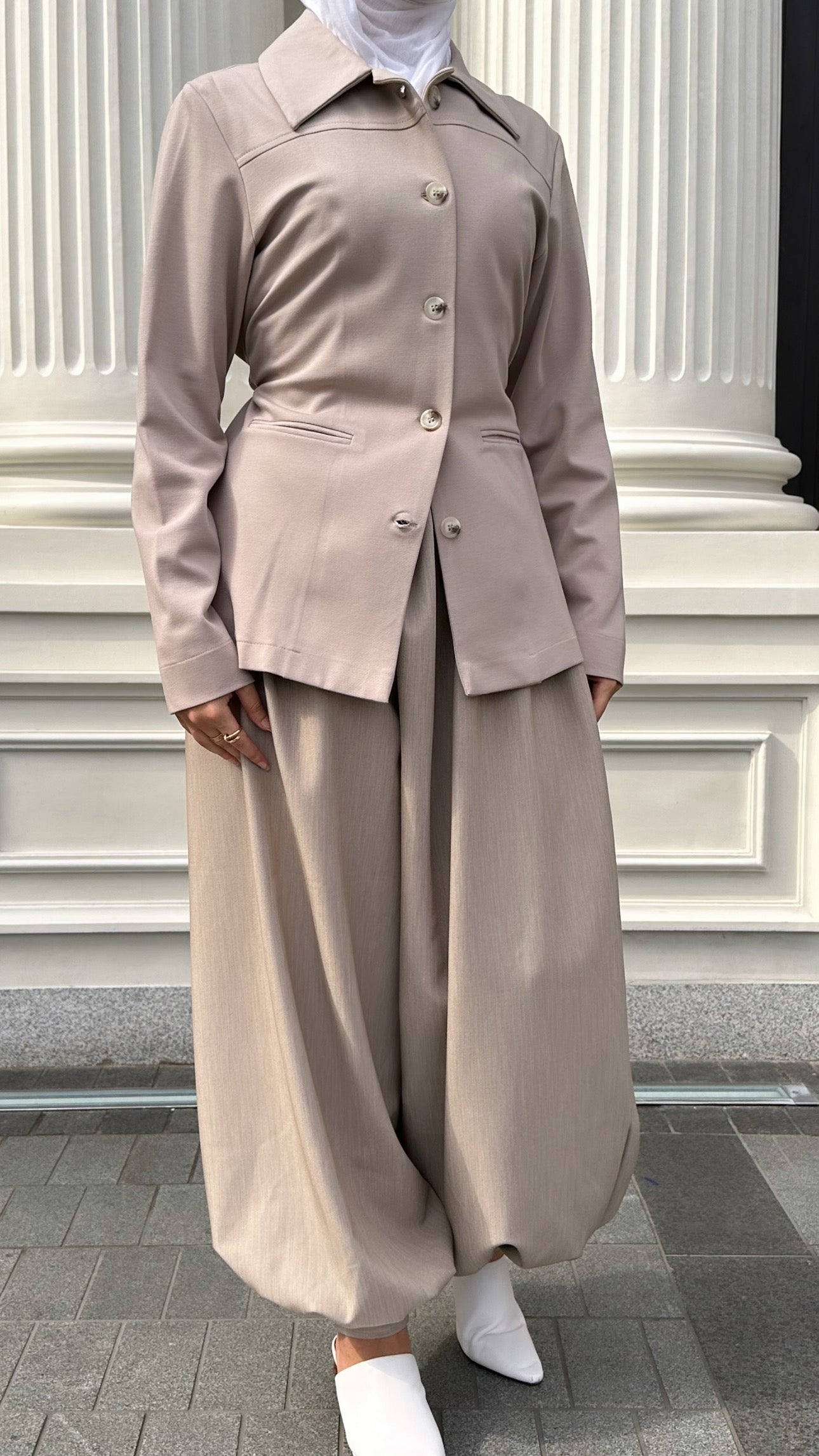 The jacket features a clean-cut design with subtle stitching and button detailing, paired with relaxed high-waist trousers for a graceful flow and comfort