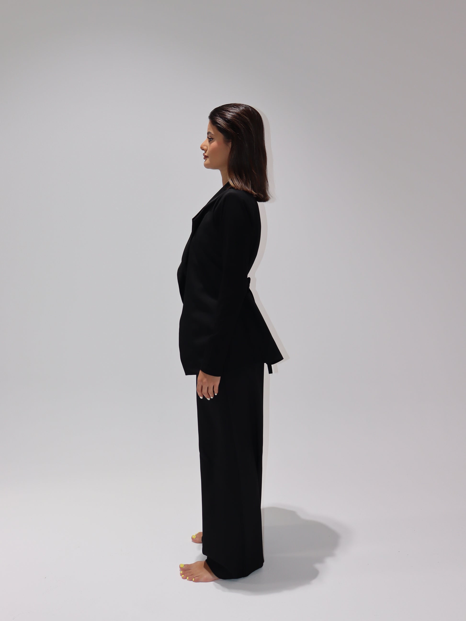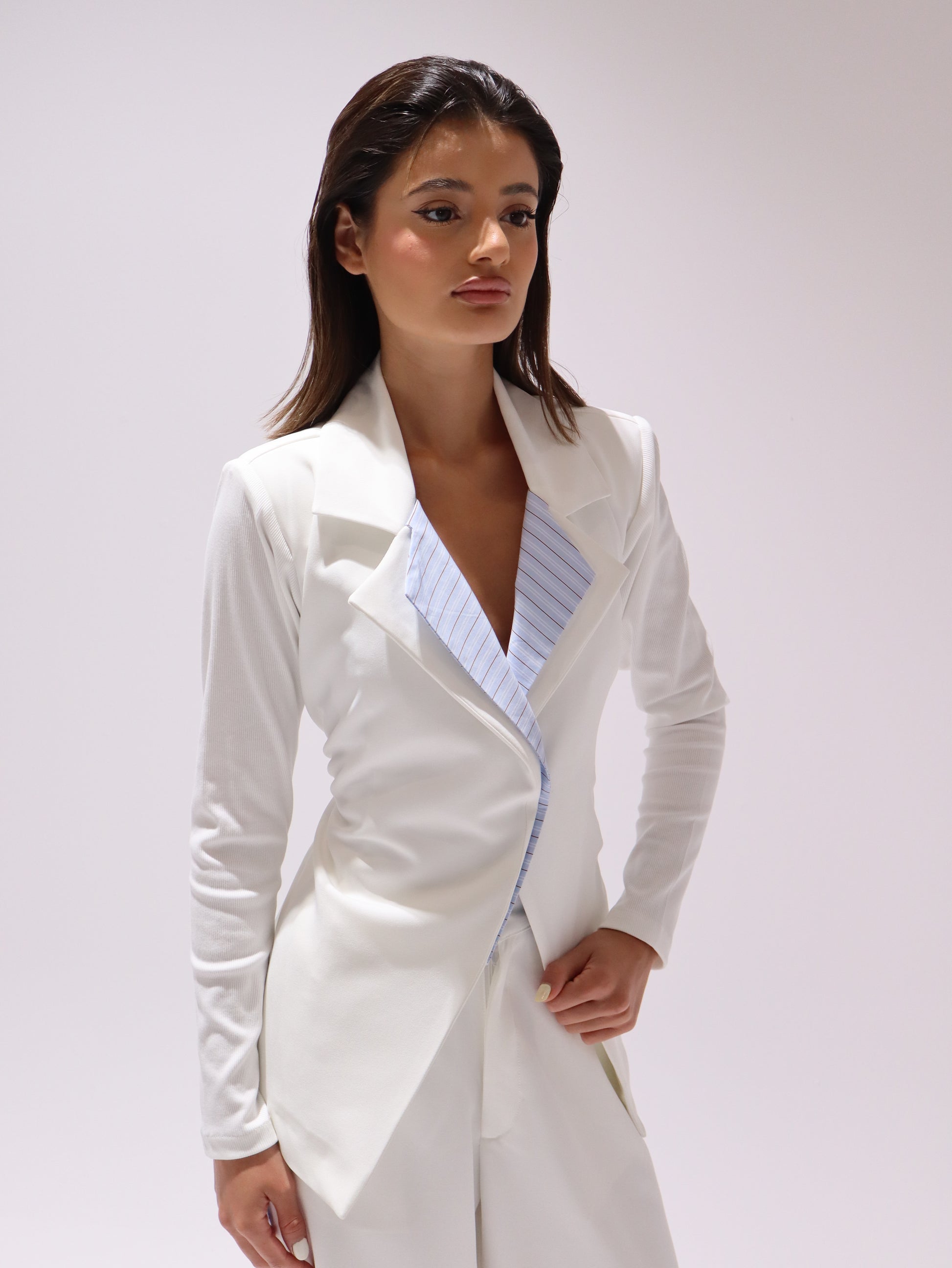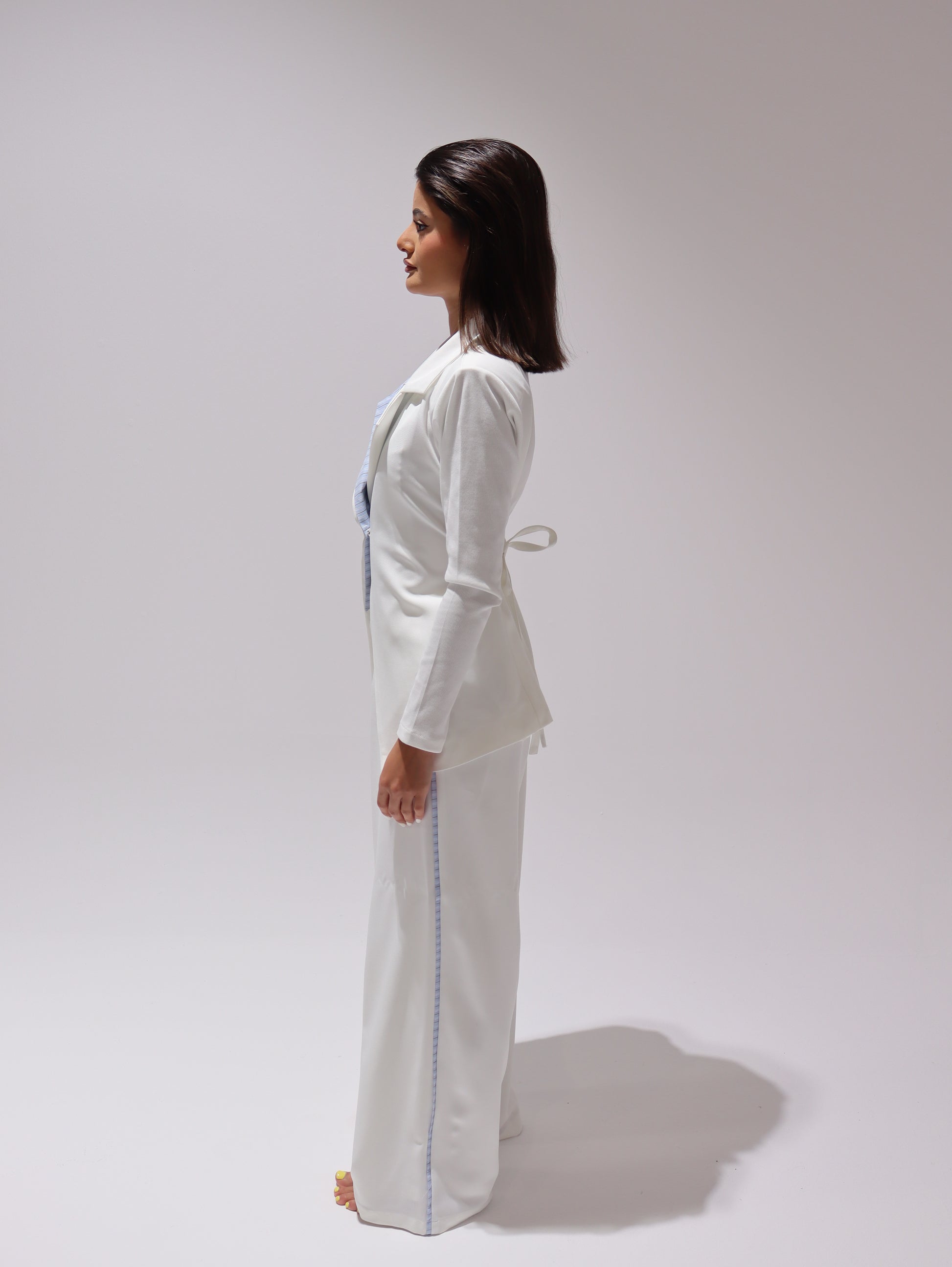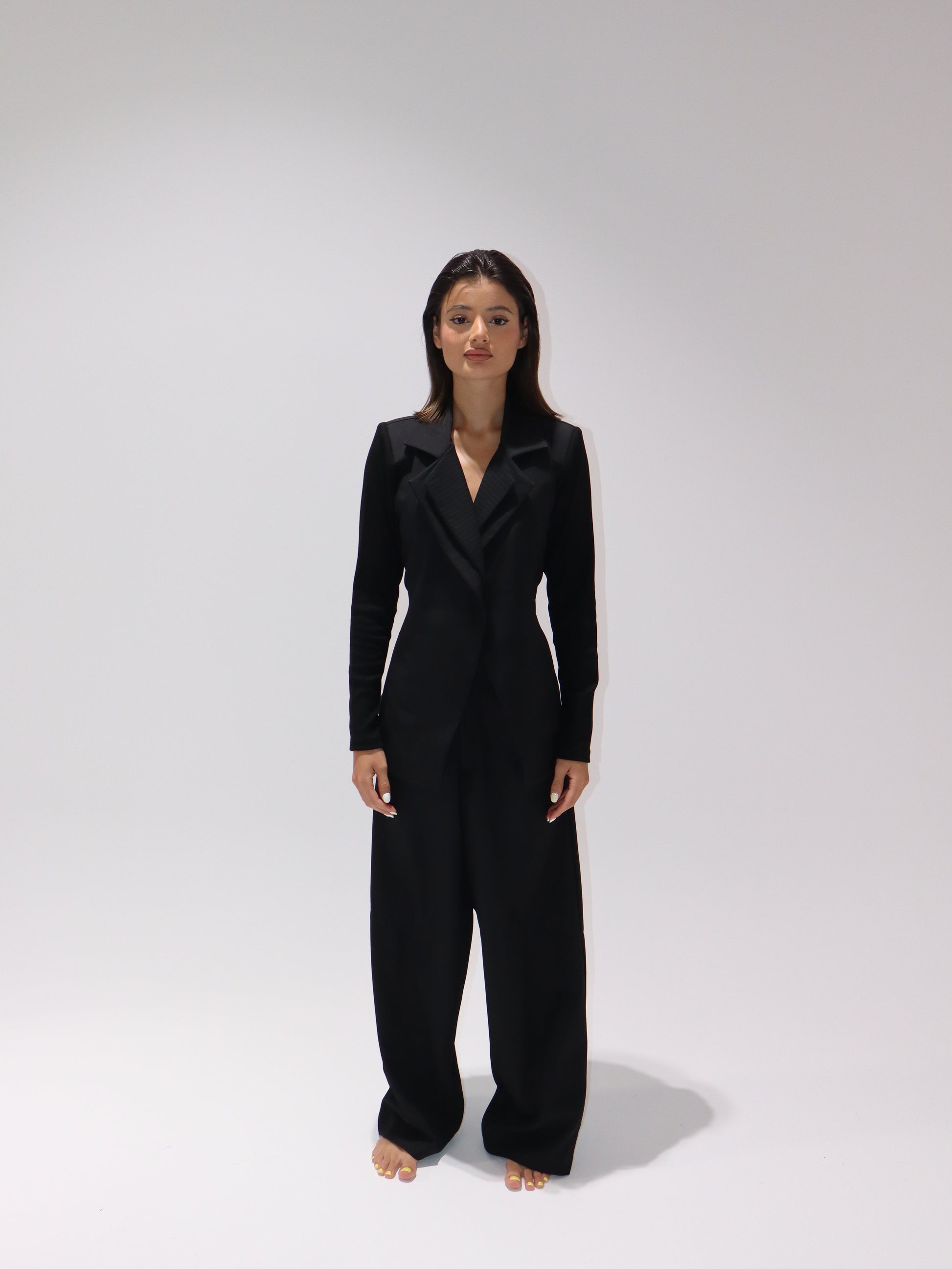 A structured tailored suit with sharp lapels and wide-leg trousers, elevated by contrast striped detailing for a refined modern edge.