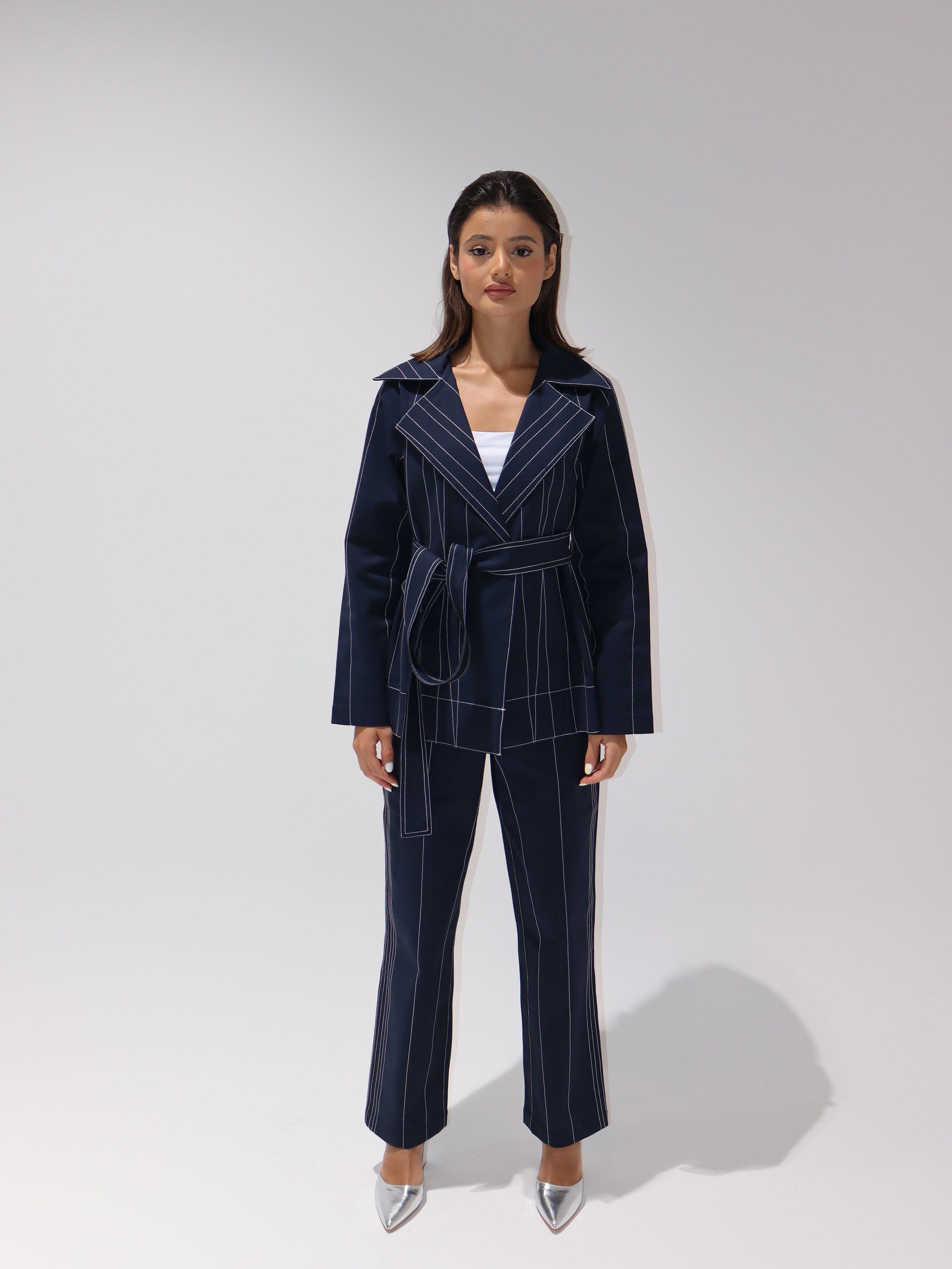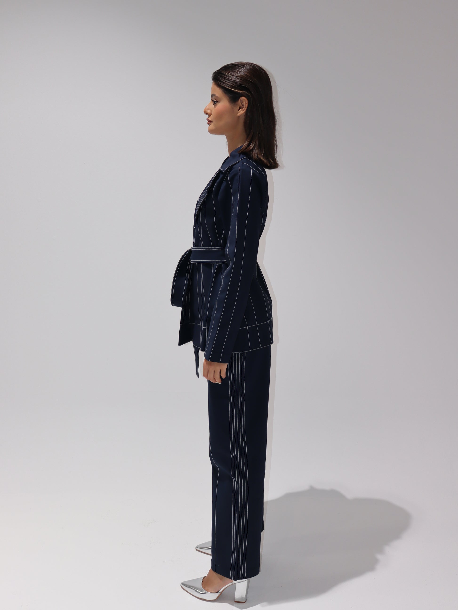 Navy pinstripe set features a tailored blazer with white contrast stitching and a flattering waist tie, paired with straight-leg trousers for a polished finish