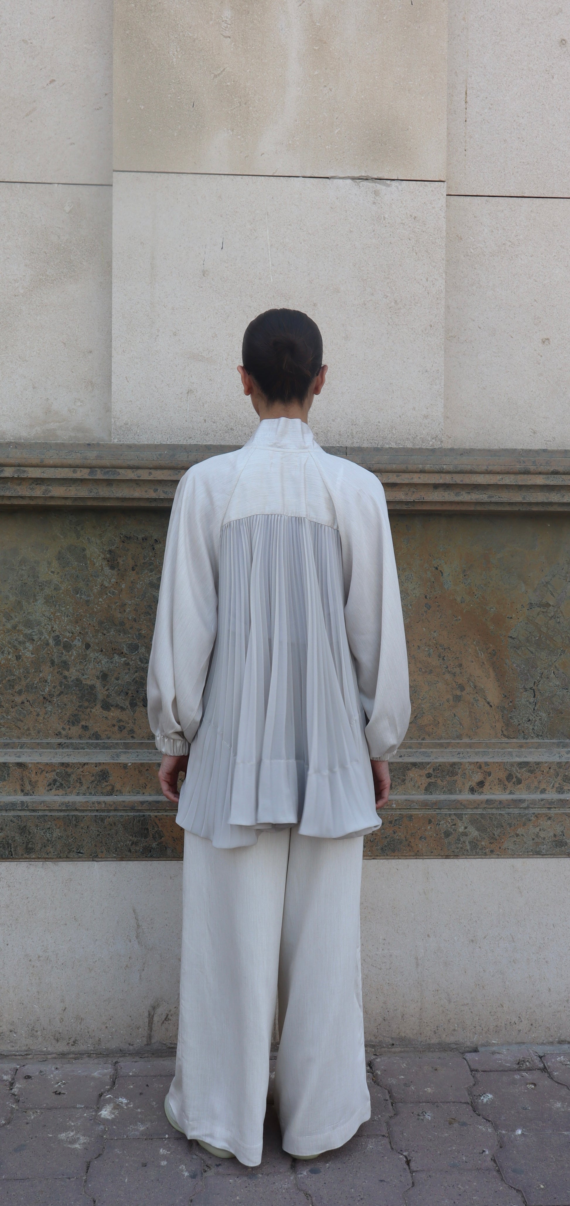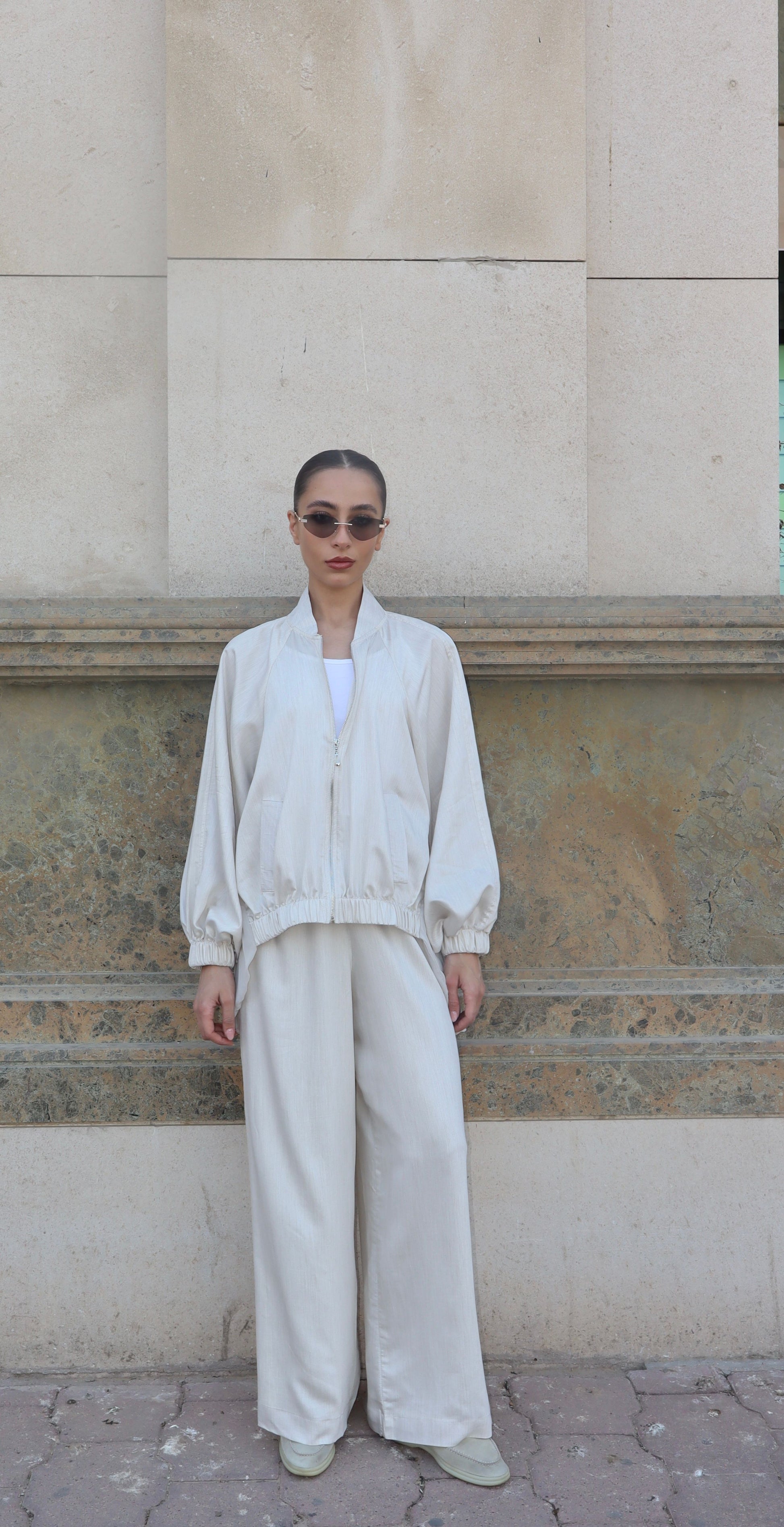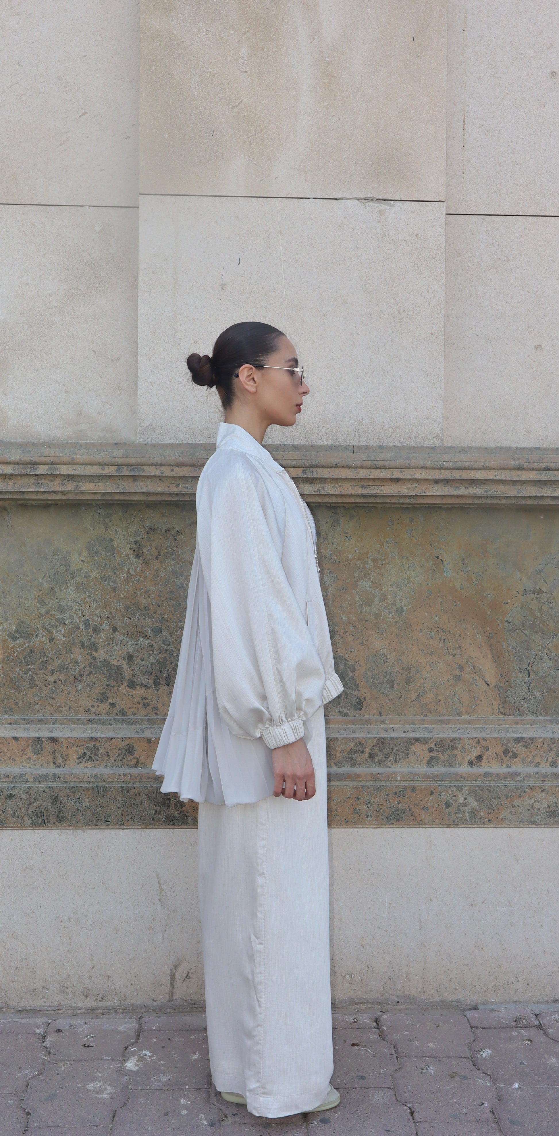 Relaxed-fit, wide-leg trousers with a Bomber jacket pleated on the back