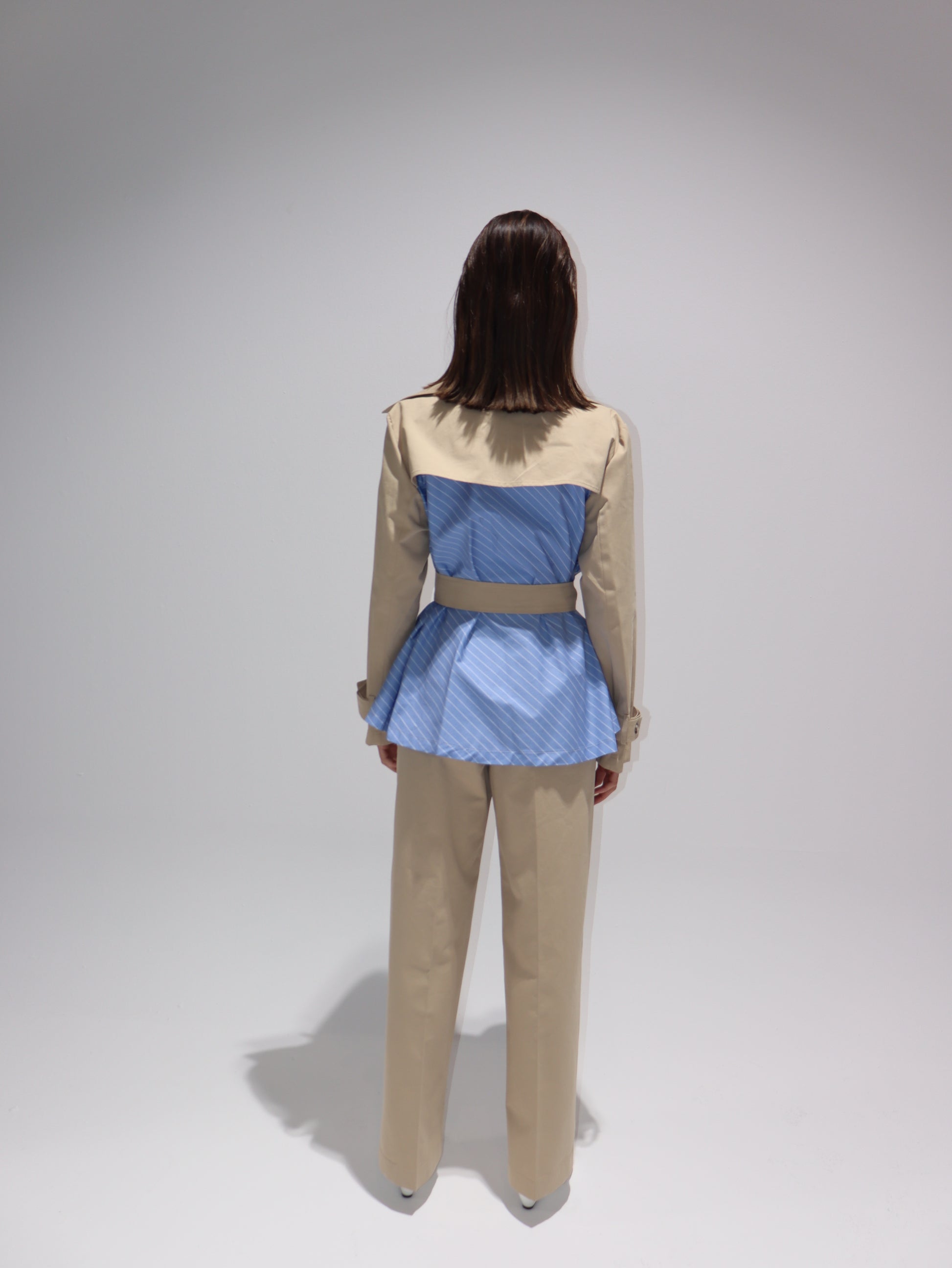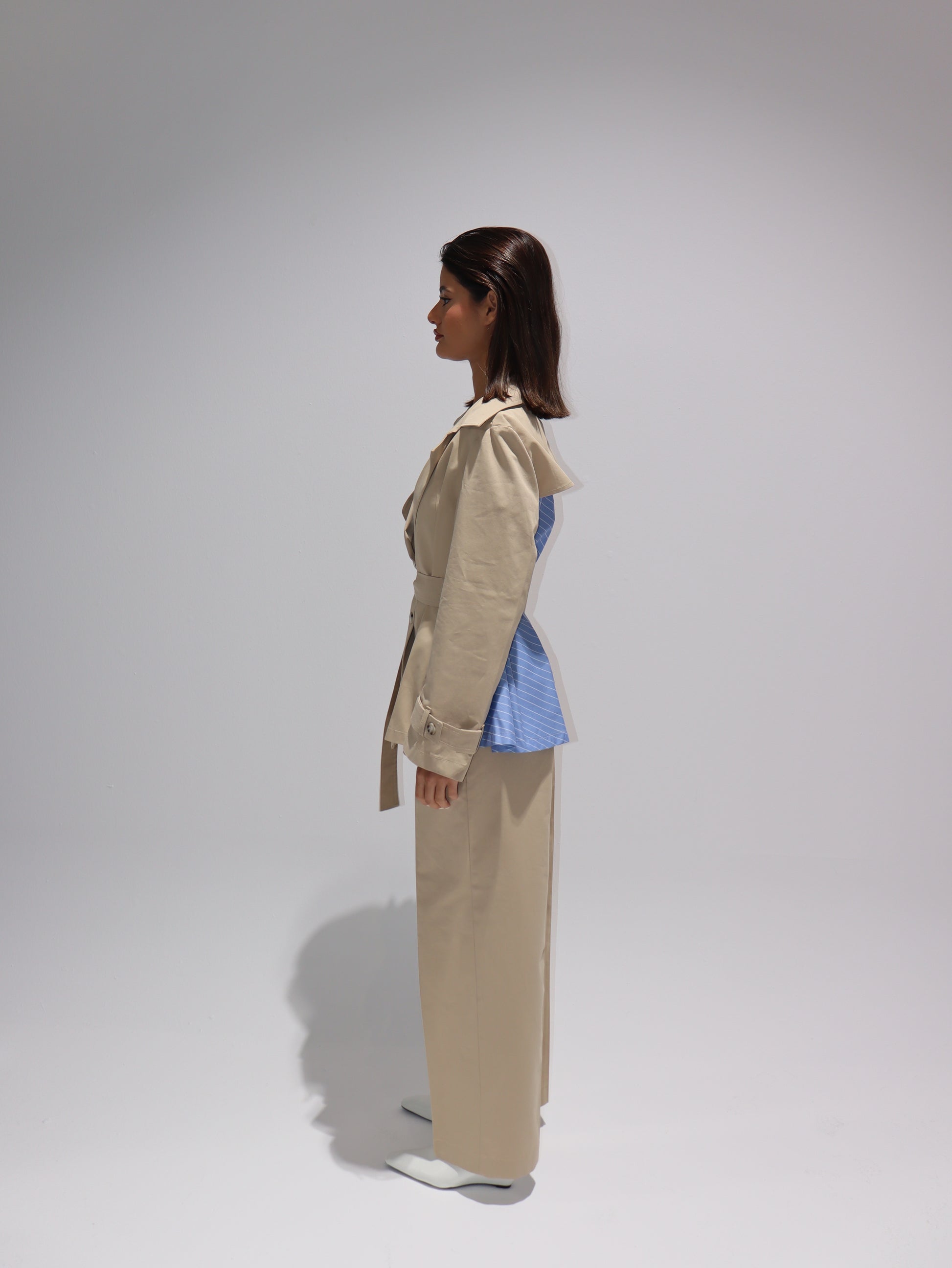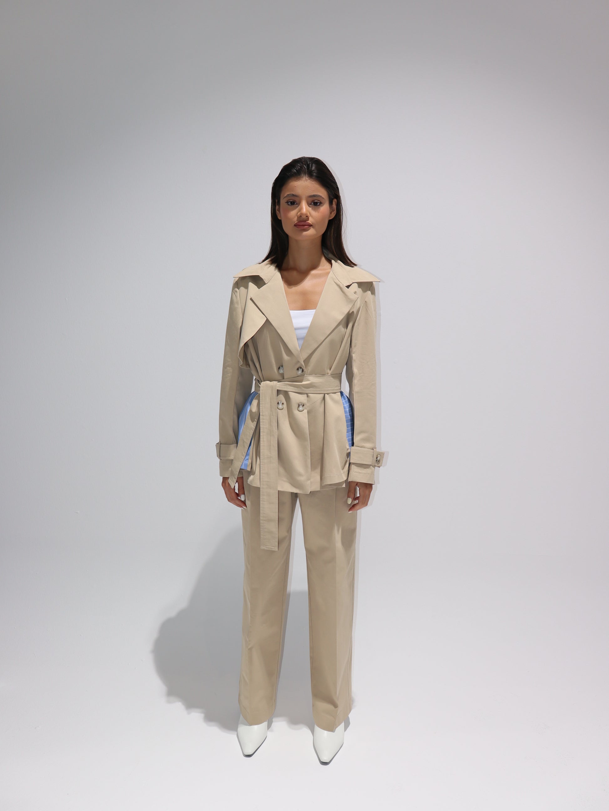A modern twist on the classic trench suit. Designed in beige with a subtle blue lining detail, this set combines elegance with functionality. The belted waist and double-breasted cut give it a sharp office-ready look